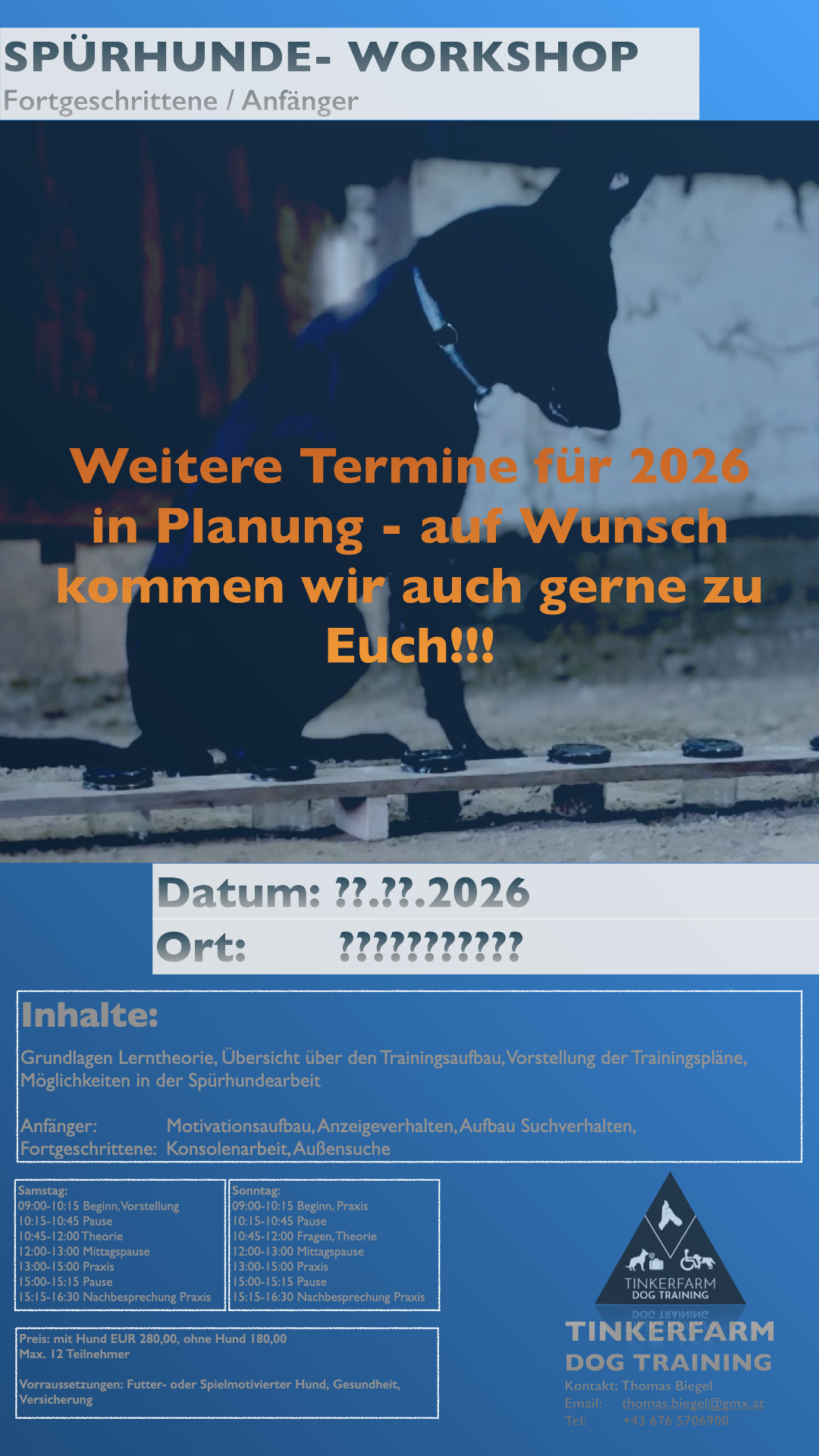 TINKERFARM DOG TRAINING umfasst ein Angebot an Hundetraining für den Alltag, speziell Welpen und Junghunde, Training für den Rettungshundebereich, Ausbildung von Spürhunden (in allen Bereichen), weiters Ausbildung von Assistenzhunden und Therapiebegleithunden.
